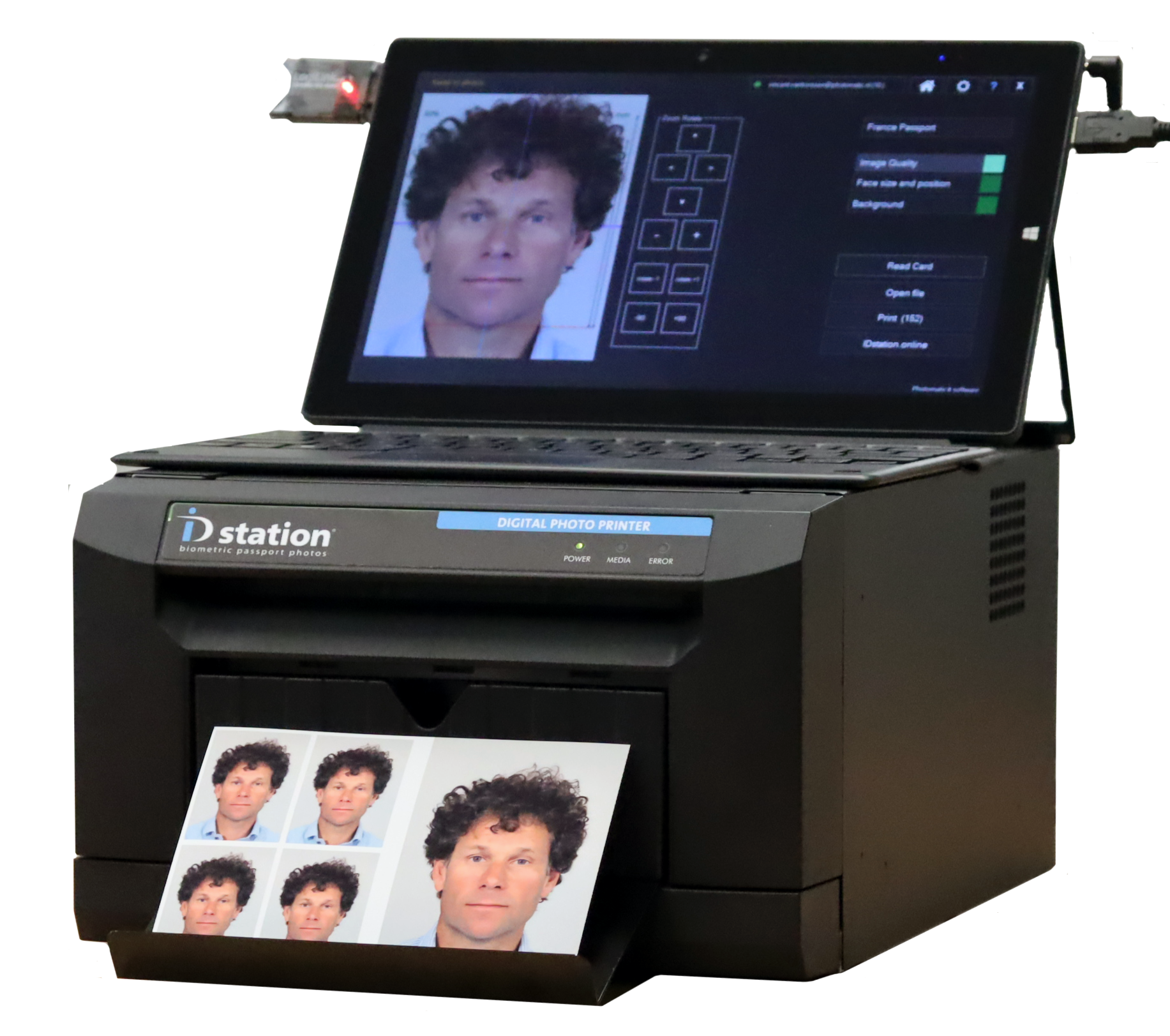 The ID Station passport photo printer system includes a camera for capturing high-quality images, a printer for producing compliant passport photos, and a tablet/PC to manage photo settings and printing.